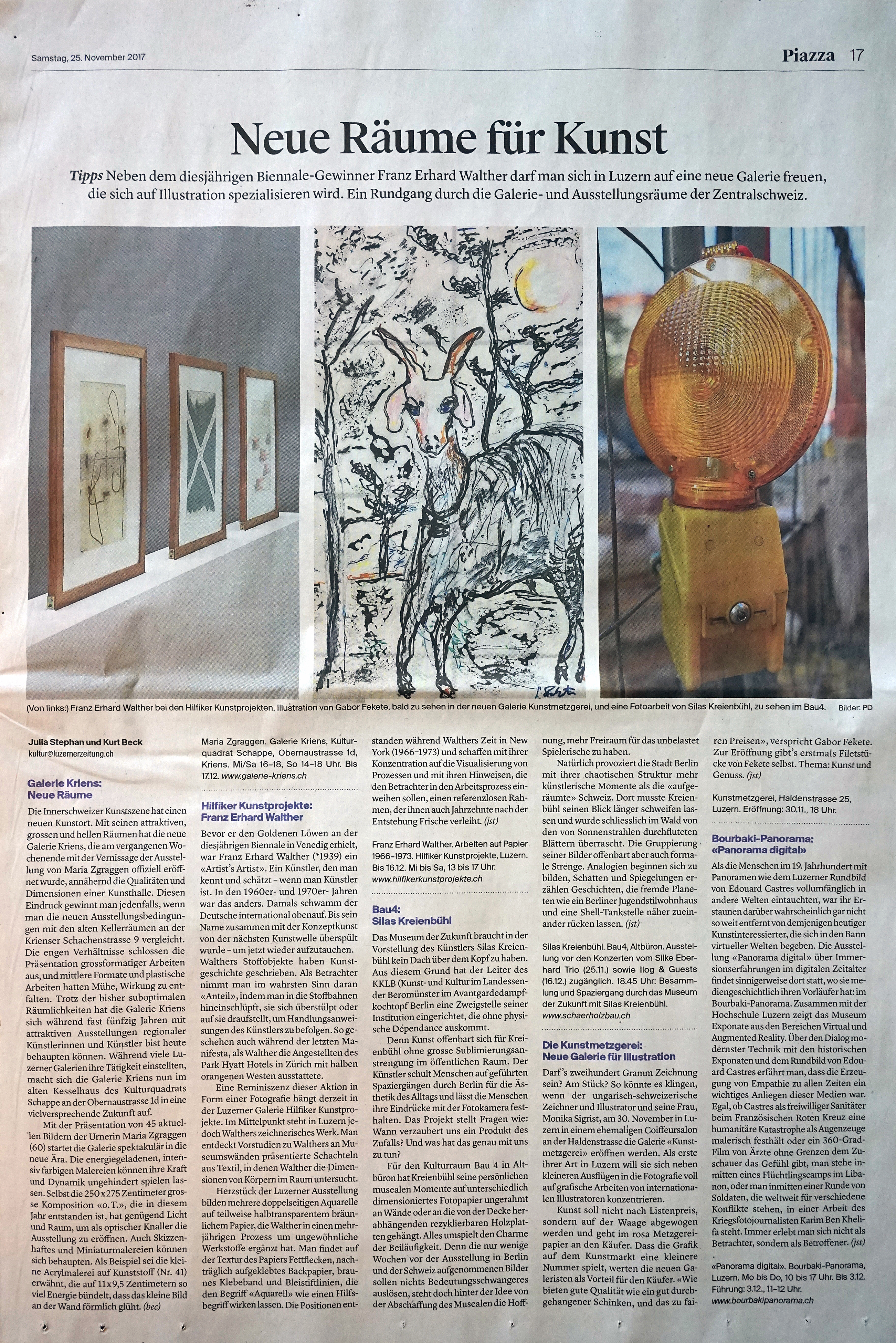 - Luzerner Zeitung vom 25.11.17 über die Ausstellung «Museum der Zukunft» im bau 4 in Altbüron (Julia Stephan): «Neue Räume für Kunst»